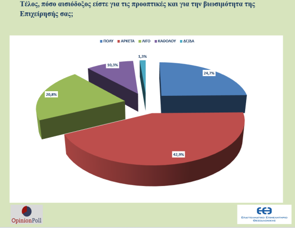 - Υπάρχει απαισιοδοξία ως προς την βιωσιμότητα Επιχειρήσεων από περίπου έναν στους τρεις . Το 20.8% δηλώνει λίγο και το 10.3% καθόλου αισιόδοξο για τις προοπτικές και την βιωσιμότητα της Επιχείρησής του. Το 24.7% δηλώνει πολύ αισιόδοξο και το 42.9% αρκετά.
