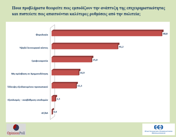- Ως βασικά προβλήματα που εμποδίζουν την ανάπτυξη της επιχειρηματικότητας αναδεικνύονται με διαφορά, η φορολογία με 58.8% και το υψηλό λειτουργικό κόστος με 41.2%. Ακολουθούν, η γραφειοκρατία με 25%, η μη πρόσβαση σε χρηματοδότηση με 16.9%, η έλλειψη εξειδικευμένου προσωπικού με 15.3% και ο εξοπλισμός, αναβάθμιση υποδομών με 2.3%. Σημειώνεται, ότι υπήρχε δυνατότητα για δύο απαντήσεις.