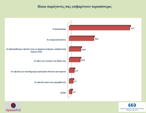 Ιδιαίτερο ενδιαφέρον παρουσιάζουν τα συμπεράσματα της μεγάλης έρευνας της OPINIONPOLL για λογαριασμό του Επαγγελματικού Επιμελητηρίου Θεσσαλονίκης (Ε.Ε.Θ.), με στόχο την διερεύνηση των προβλημάτων, των αναγκών και των προοπτικών των Μικρομεσαίων Επιχειρήσεων.