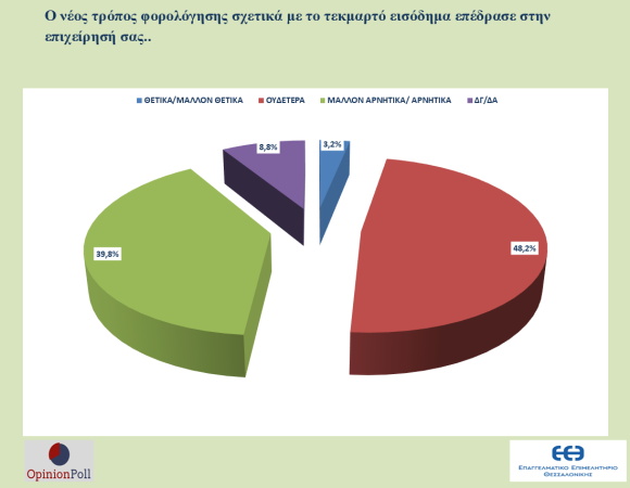 - Το 39.8% δηλώνει ότι η φορολόγηση με βάση το τεκμαρτό εισόδημα επέδρασε αρνητικά στις Επιχειρήσεις, ενώ το 48.2% ότι η επίδραση ήταν ουδέτερη.