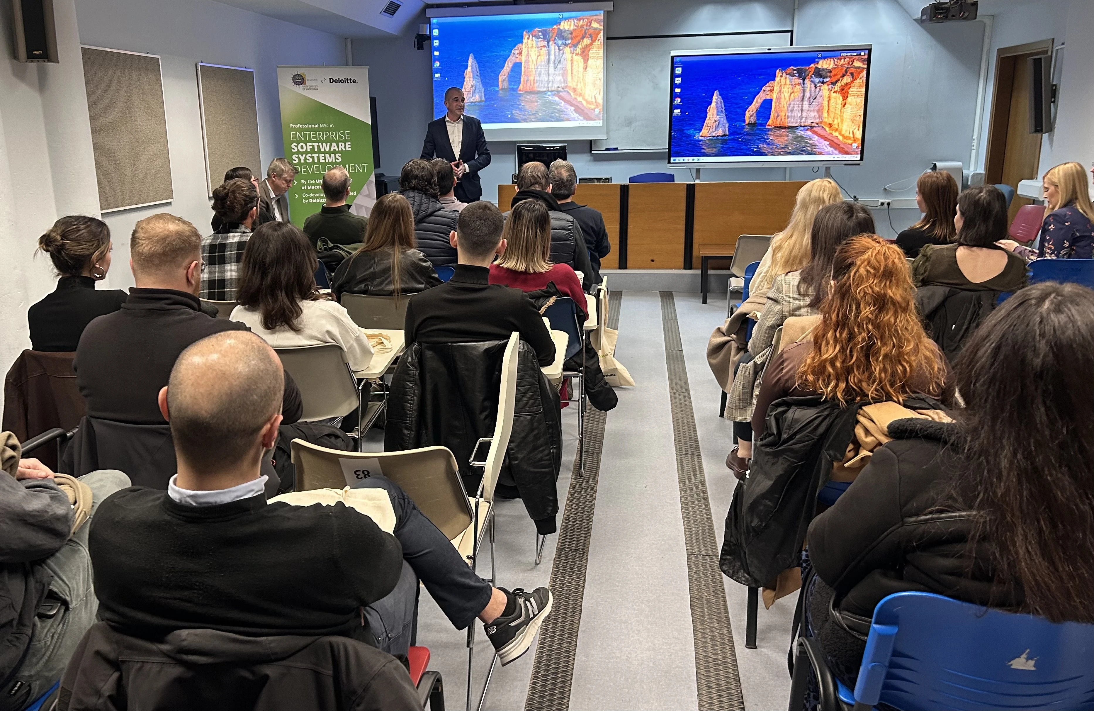 Το πρόγραμμα, όπως πρόσθεσε, «βασίζεται στη συνεργασία ενός εξαιρετικού ακαδημαϊκού ιδρύματος όπως το Πανεπιστήμιο Μακεδονίας και μιας πολυεθνικής εταιρίας όπως η Deloitte, συνδυάζοντας από τη μια το ακαδημαϊκό υπόβαθρο και από την άλλη τις πρακτικές ανάγκες της διεθνούς αγοράς εργασίας στο κομμάτι της πληροφορικής», άρα «δίνει στους φοιτητές τον καλύτερο συνδυασμό, και θεωρητικές γνώσεις και πρακτικές γνώσεις που μπορούν να βγουν κατευθείαν στην αγορά και να εργαστούν». «Αυτά τα παιδιά με το που θα αποφοιτήσουν θα είναι τα πλέον περιζήτητα στην αγορά. Χαρά μας να έρθουν και στην Deloitte» επισήμανε.
