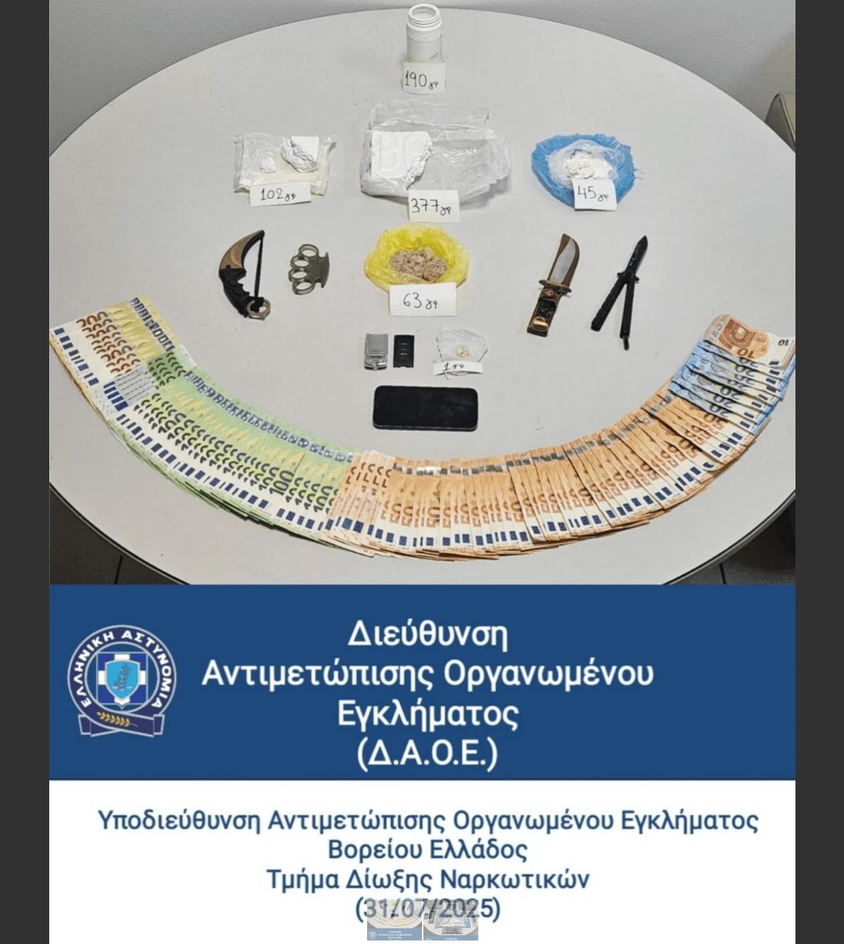 Επίσης κατασχέθηκε η δίκυκλη μοτοσυκλέτα ιδιοκτησίας του κατηγορούμενου, ως μέσο διευκόλυνσης των παράνομων δραστηριοτήτων του.