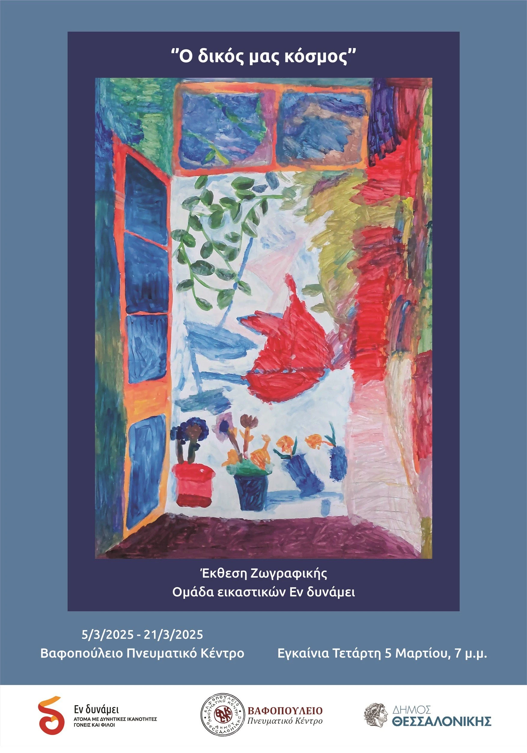 Το Βαφοπούλειο Πνευματικό Κέντρο σε συνεργασία με την ομάδα εικαστικών Εν δυνάμει θα πραγματοποιήσει έκθεση ζωγραφικής με τίτλο «Ο δικός μας κόσμος», από την Τετάρτη 5 έως και την Παρασκευή 21 Μαρτίου 2025.