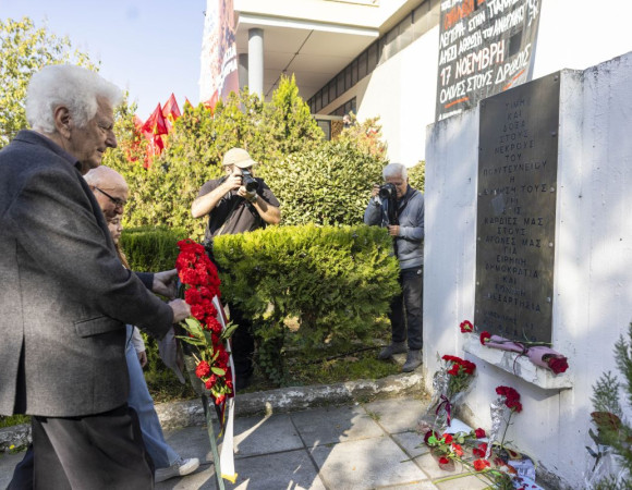Με καταθέσεις στεφάνων στο μνημείο της Πολυτεχνικής Σχολής του ΑΠΘ τίμησαν σήμερα, Κυριακή, πολίτες κάθε ηλικίας την αυριανή 52η επέτειο εξέγερσης του Πολυτεχνείου.