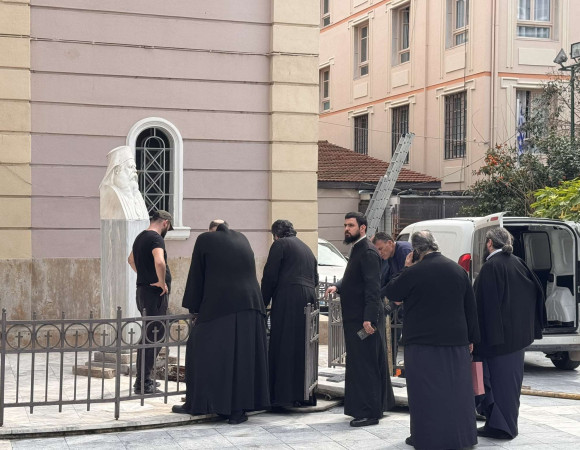 Υπό την επίβλεψη ιερέων πραγματοποιούνται οι ετοιμασίες στο κενοτάφιο του Μητροπολίτη Γενναδίου που βρίσκεται δίπλα από την είσοδο του Μητροπολιτικού Ναού.